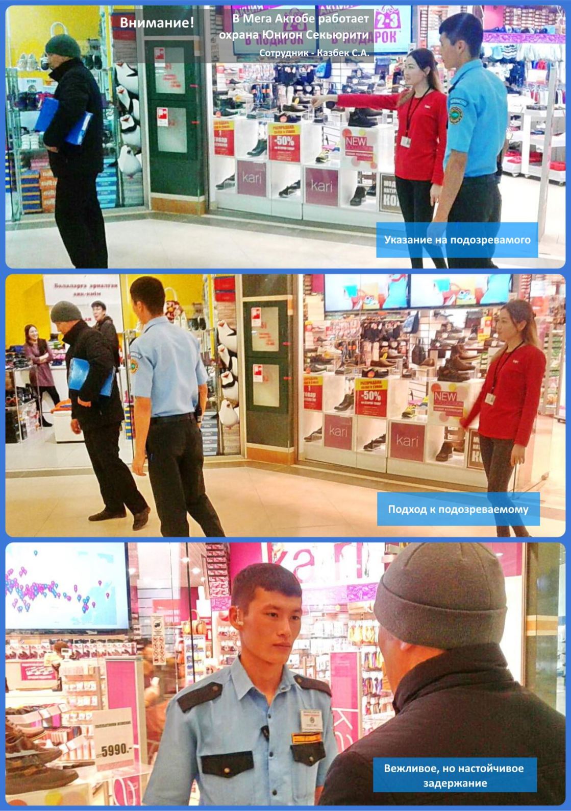 произошла кража сумки для ноутбука стоимостью 9 000тг. Продавцы бутика вызвали сотрудника охраны – Утемуратова Н.М. и попросили задержать вора, который выбежал из помещения и попытался скрыться в зале, среди посетителей ТРЦ. Подозреваемый, после недолгой погони и умелого задержания, доставлен в комнату инспекторов. После опознания продавцом украденного товара он сознался в содеянном. Преступник 1989 г.р., временно не работающий.
