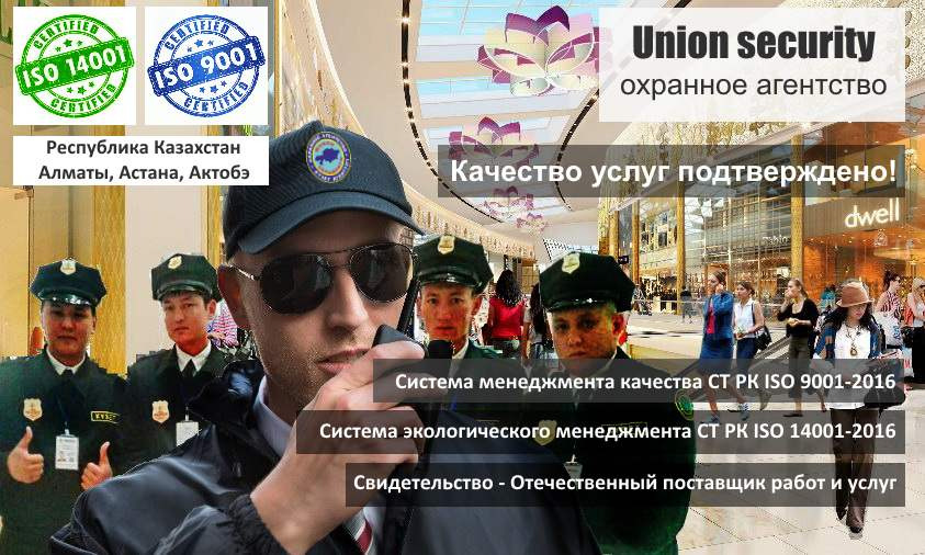 Охранное агентство «Юнион секьюрити» подтвердило свое лидерство на рынке охранных услуг Казахстана, успешно пройдя сертификацию в Системе менеджмента качества СТ РК ISO 9001-2016 и Системе экологического менеджмента СТ РК ISO 14001-2016.